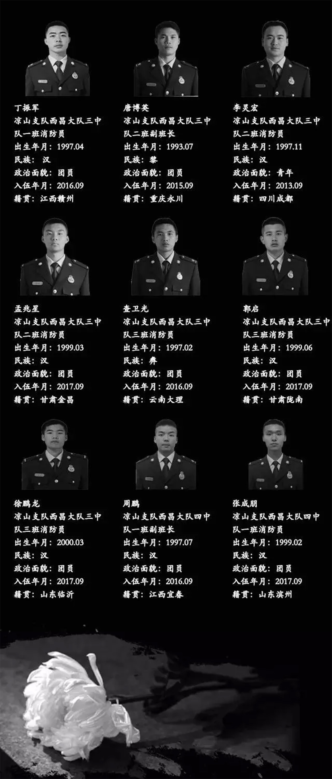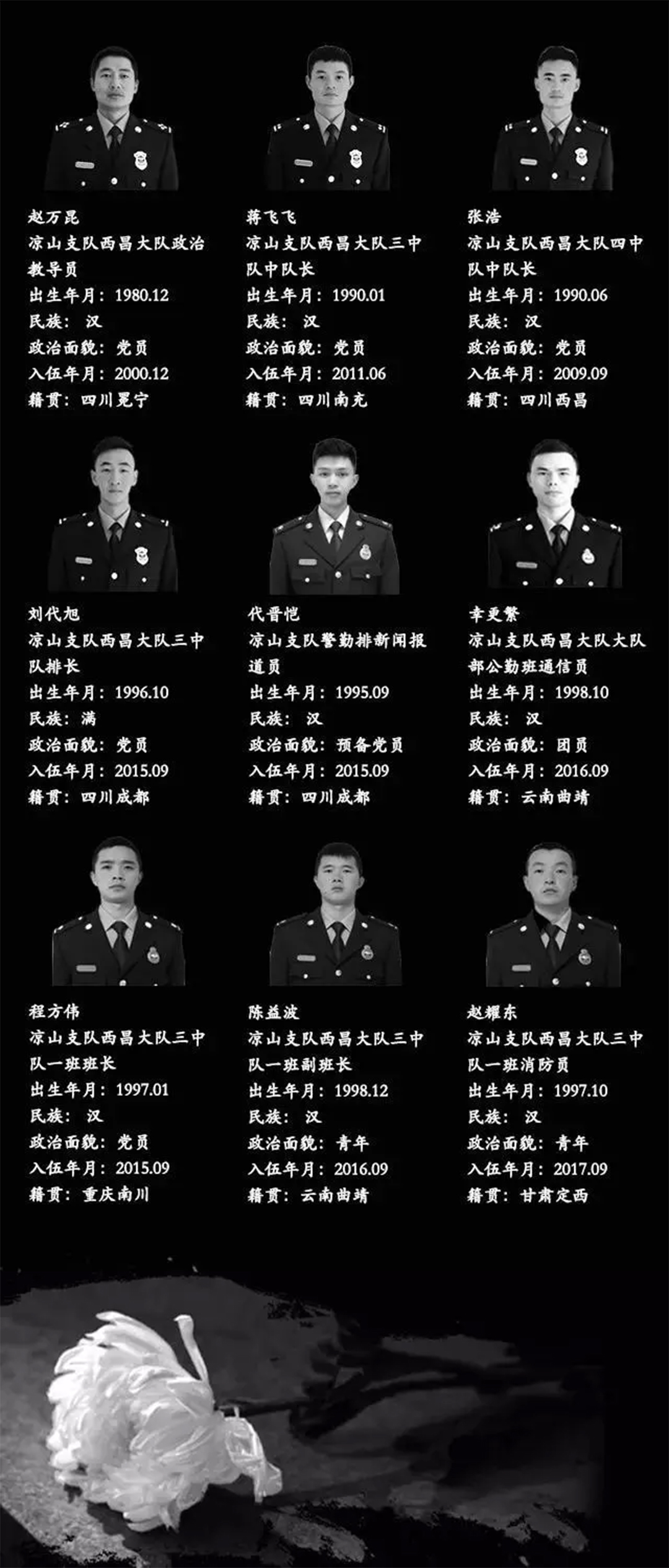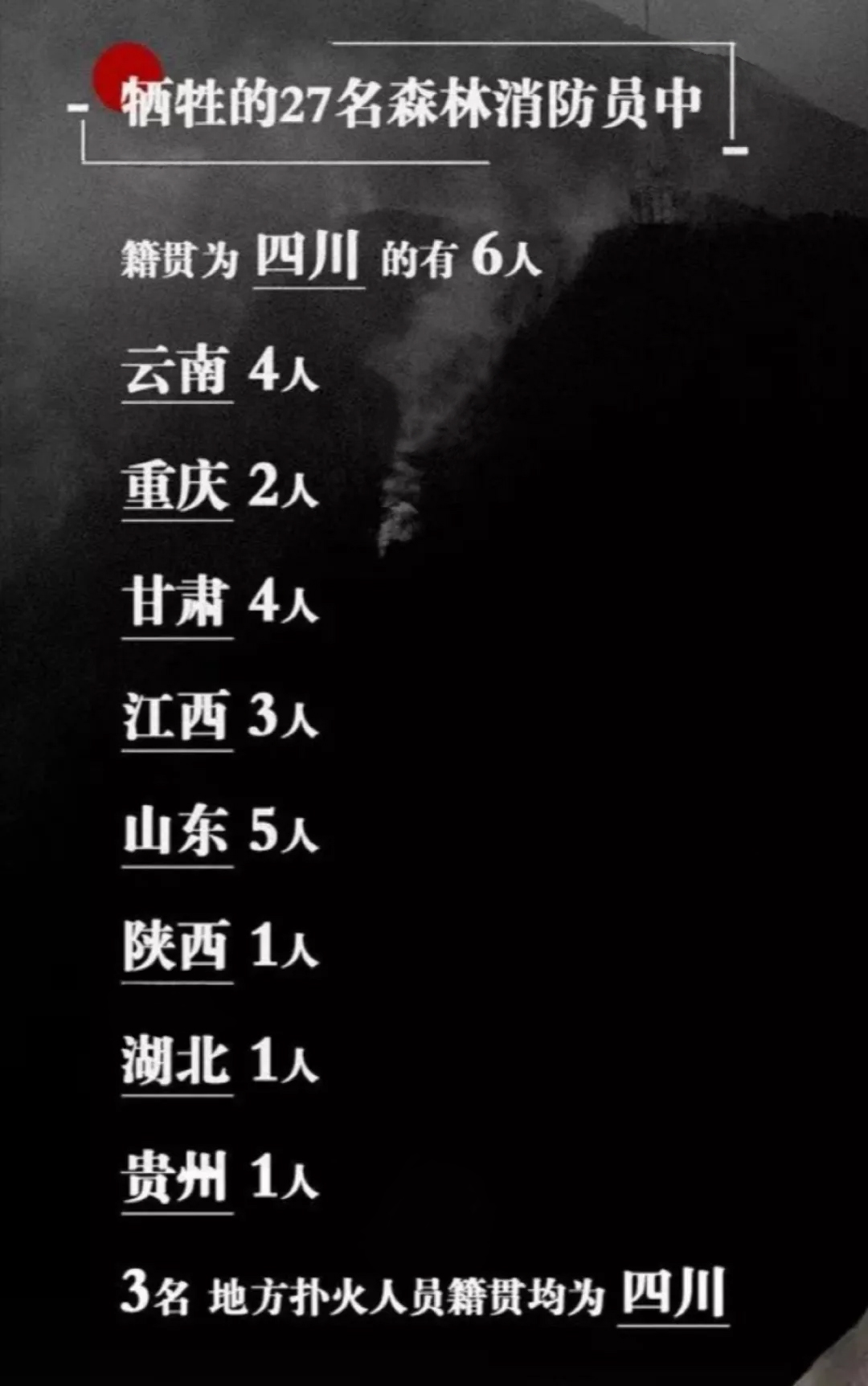 這是一場慘烈的“斗爭”,為了拯救人民財(cái)產(chǎn)、動(dòng)植物等的犧牲,這是一份沉重的名單,經(jīng)統(tǒng)計(jì)核實(shí),有27名同志系涼山州森林消防支隊(duì)指戰(zhàn)員。27人中有干部4人、消防員23人。漢族22人、滿族1人、黎族1人、彝族2人、畬族1人。1980年后出生1人,1990年后出生24人,2000年后出生2人,年齡最小為2000年7月出生。中共黨員9人(含預(yù)備黨員1人),共青團(tuán)員11人,青年7人。